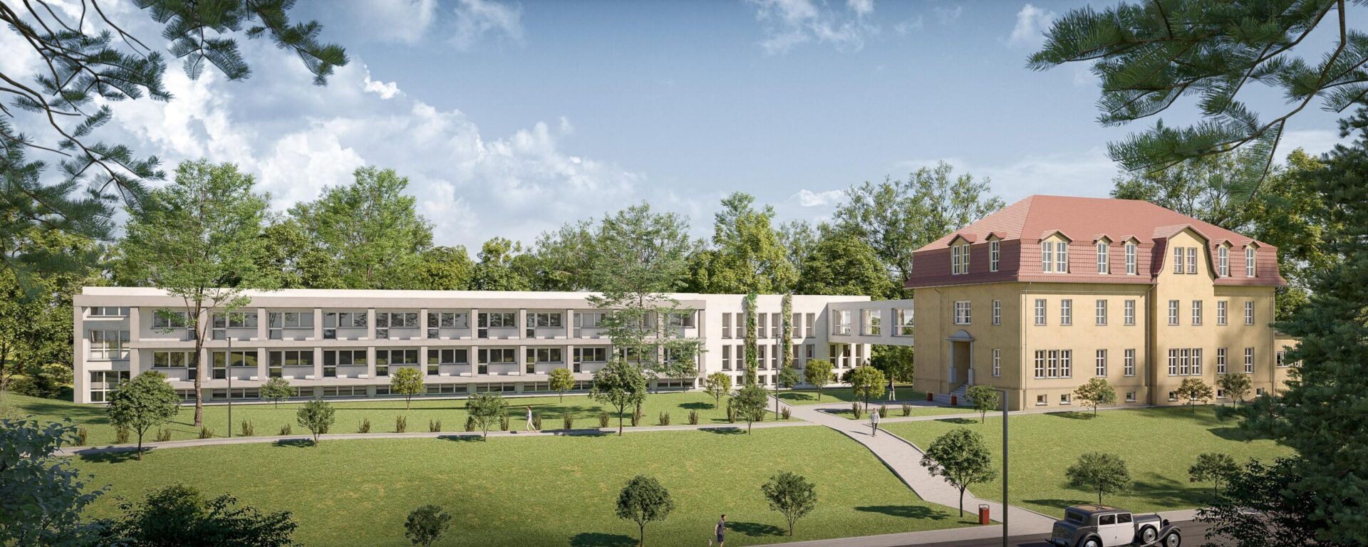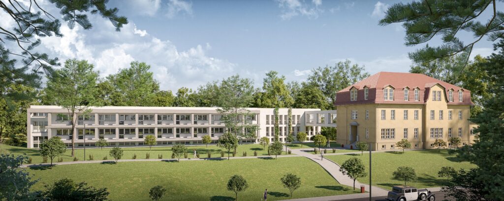 In Etzelbach, wenige Kilometer vor Rudolstadt verkehrsgünstig an der B88 gelegen, planen wir den Umbau der ehemalige Rheumaklinik und erweitern sie um einen Neubau, der sich harmonisch in die naturbelassene Umgebung mit ihrem Eichenwald einfügt. Neben 84 Pflegeplätzen sollen 10 Plätze für palliative Versorgung entstehen. Derzeit läuft das Verfahren zur Änderung des bestehenden Bebauungsplanes. Der Betreiber der Anlage kommt aus Chemnitz.